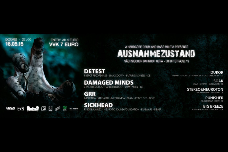 Was machen wir eigentlich? In erster Linie wollen wir das musikalische Ödland Thüringens um eine kleine weitere Attraktion bereichern. Da es hier nicht so richtig viel in der Richtung gibt, möchten wir euch (und uns) wenigstens ab und an eine Anlaufstelle für harte elektronische Musik bieten. Zwar ist es schön für Events hunderte Kilometer durch halb Mitteleuropa zu fahren, doch fehlen vergleichbare Angebote in unserer Region schlichtweg. So war die Idee geboren und wenig später darauf Ausnahmezustand.