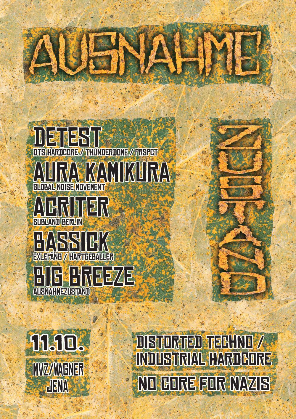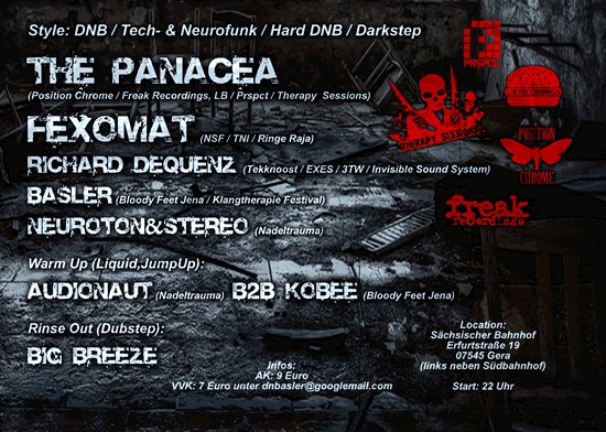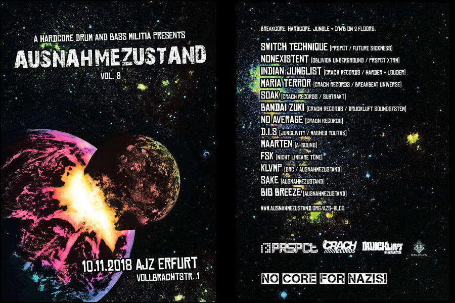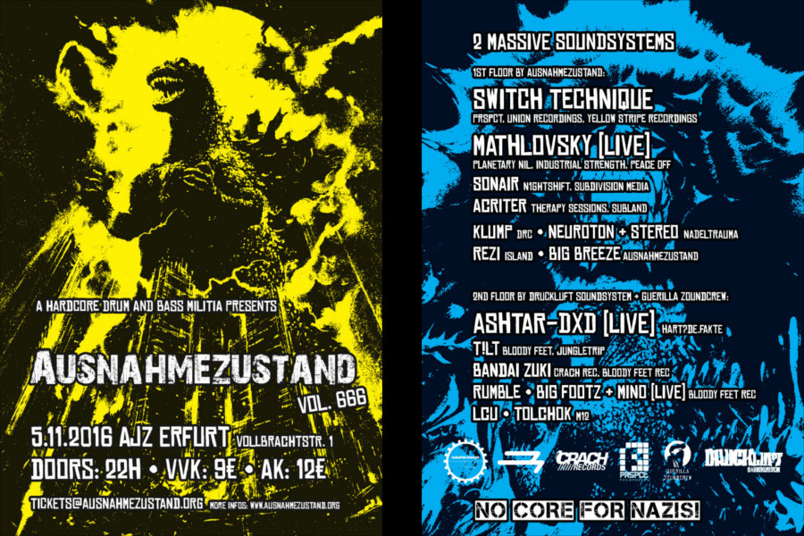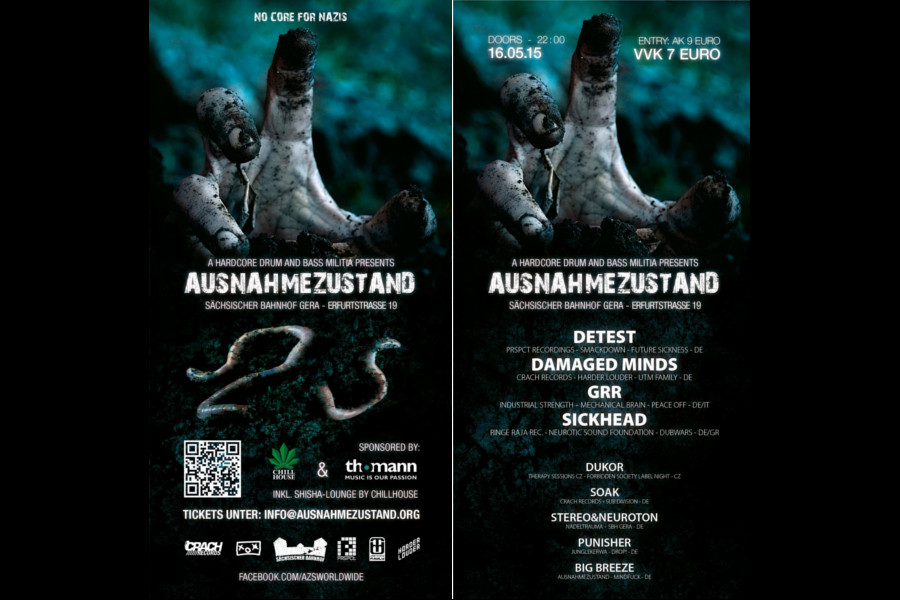 Was machen wir eigentlich? In erster Linie wollen wir das musikalische Ödland Thüringens um eine kleine weitere Attraktion bereichern. Da es hier nicht so richtig viel in der Richtung gibt, möchten wir euch (und uns) wenigstens ab und an eine Anlaufstelle für harte elektronische Musik bieten. Zwar ist es schön für Events hunderte Kilometer durch halb Mitteleuropa zu fahren, doch fehlen vergleichbare Angebote in unserer Region schlichtweg. So war die Idee geboren und wenig später darauf Ausnahmezustand.