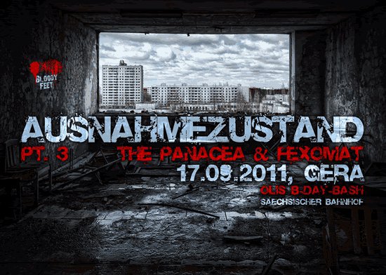 Was 2010 ins Rollen geraten ist, war kein Zufall. Von langer Hand geplant, haben Basler und Oli ein Projekt aus dem Boden gestampft, das der Musikszene in Thüringen kein größeres Geschenk hätte machen können – na gut, vielleicht nicht für jeden... So oder so erblickte Ausnahmezustand am 27.11.2010 im Sächsischen Bahnhof in Gera das Licht der Welt. Getrieben von absolutem Größenwahn konnte AZS immer weiter wachsen, um sich Stück für Stück weiter zu entwickeln.